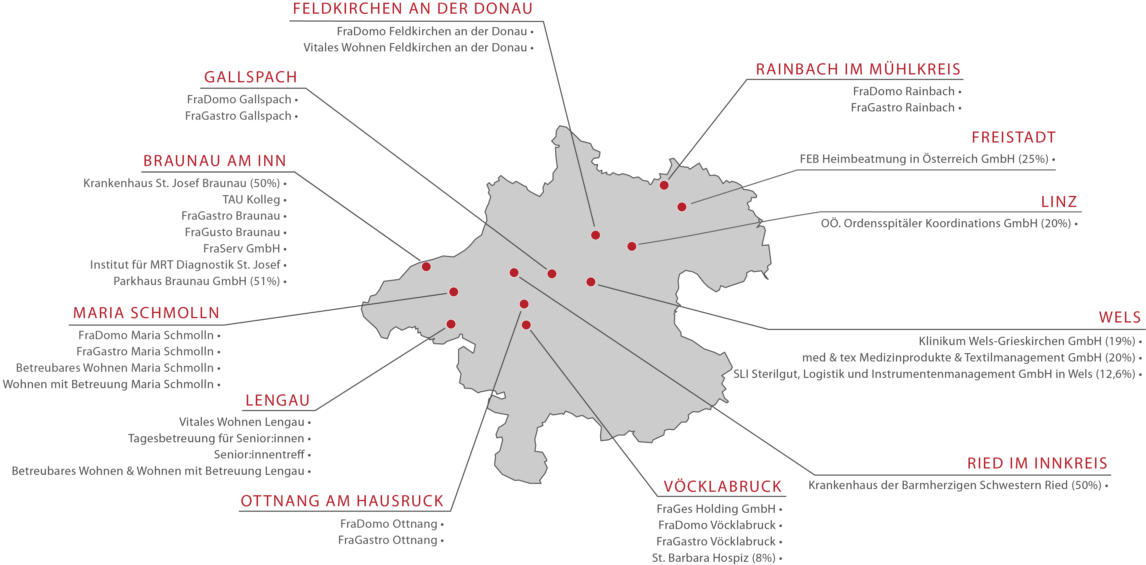 Zu den Einrichtungen der FraGes Holding zählen im Gesundheitssektor das Ordensklinikum Innviertel mit je 50% Beteiligung am Krankenhaus St. Josef Braunau und dem Krankenhaus der Barmherzigen Schwestern Ried, sowie die Beteiligung am Klinikum Wels-Grieskirchen (19%) und das Institut für MRT-Diagnostik St. Josef Braunau (100%).