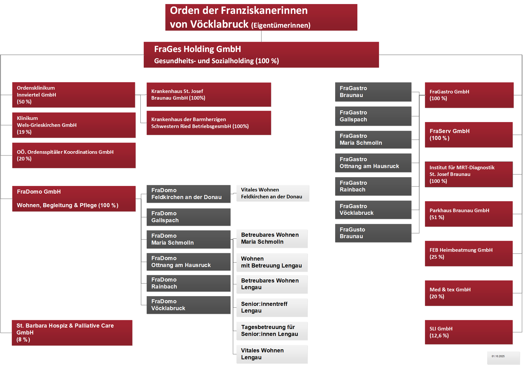 Zu den Einrichtungen der FraGes Holding zählen im Gesundheitssektor das Ordensklinikum Innviertel mit je 50% Beteiligung am Krankenhaus St. Josef Braunau und dem Krankenhaus der Barmherzigen Schwestern Ried, sowie die Beteiligung am Klinikum Wels-Grieskirchen (19%) und das Institut für MRT-Diagnostik St. Josef Braunau (100%).